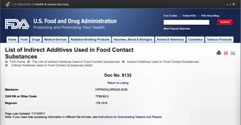 美國針對次氯酸也做了很多研究和認證,美國食品藥物管理局FDA核準次氯酸可作為: